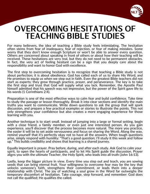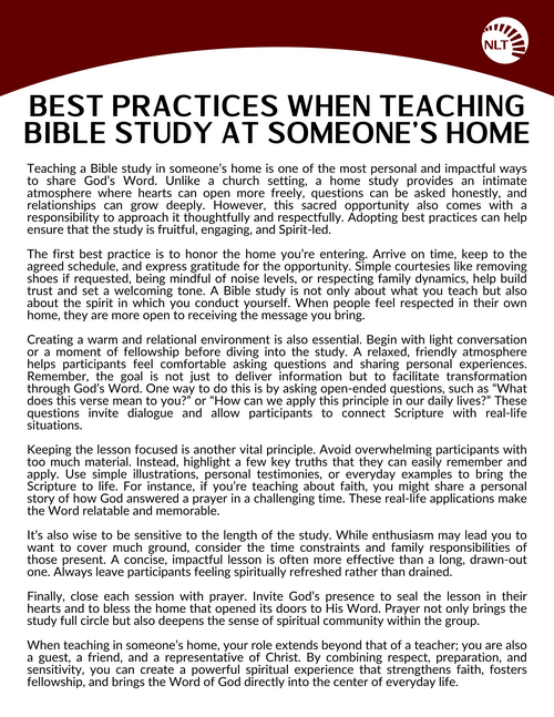 For additional support, contact Rob Mills (Bible Study Coordinator) at rmills@yournlt.com.